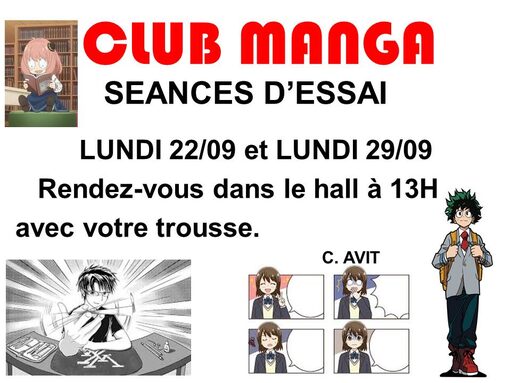 Les séances d'essai du CLUB MANGA auront lieu lundi 22/09 et lundi 29/09. Elles se dérouleront en salle C22.